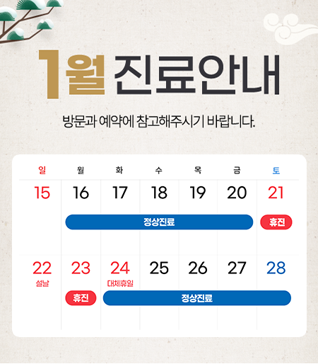 병원공지 | 23년 1월 진료 일정 안내드립니다. 페이지 정보 작성자 보스안과 작성일22-12-30 13:28 조회44,782회 댓글0건 관련링크 이전글 다음글 목록 본문 1월 21일 (토) - 1월 23일 (월) 설 휴진 1월 24일 (화) 대체 휴일은 정상 진료 합니다. 일정 확인하시어 예약 및 내원에착오 없으시길 바랍니다.감사합니다.