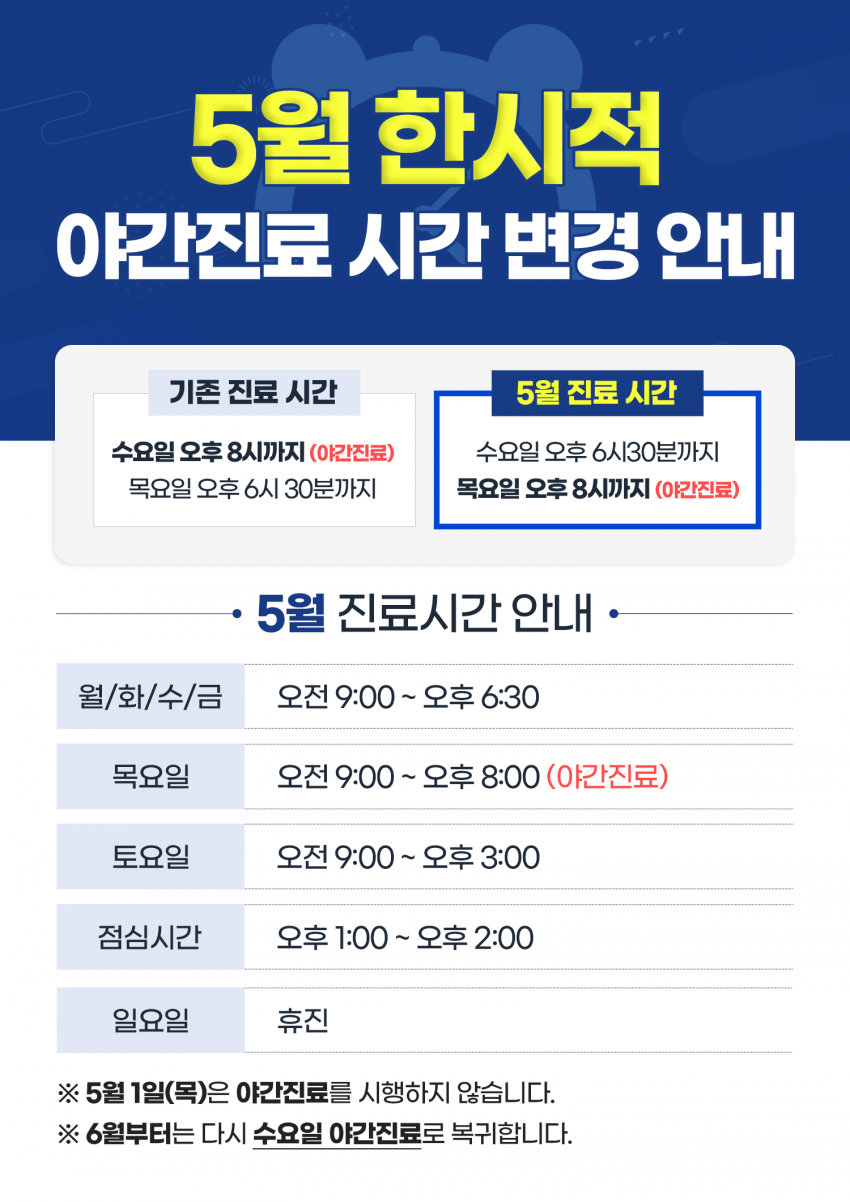 병원공지 | 5월 한시적 야간진료 시간 변경 안내