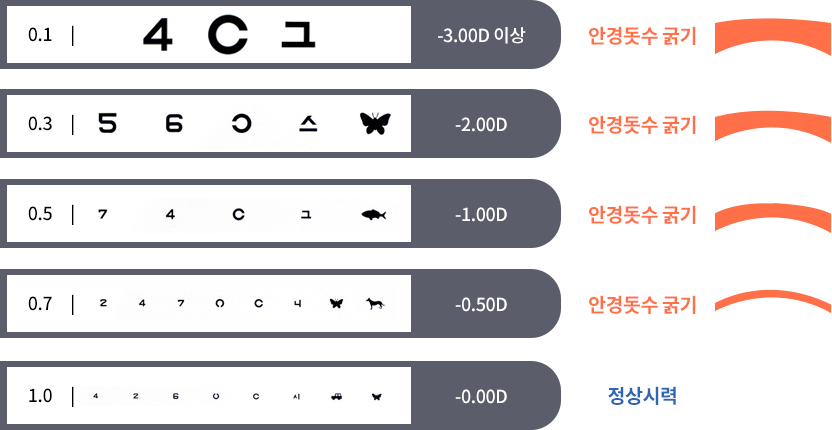 아래 표는 대략적인 수치를 나타내는 표이며, 개인차와 돗수에 따라 시력 검사표에서 보이는 시력은 다를 수 있습니다.